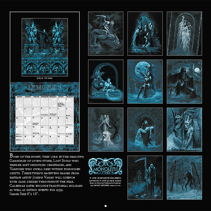 Each 12 x 12 calendar features 12 interior images that fit 8x10 frames (perfect for framing). Dates include mystical events, traditional and pagan holidays, moon phases, eclipses, solstices and equinoxes.